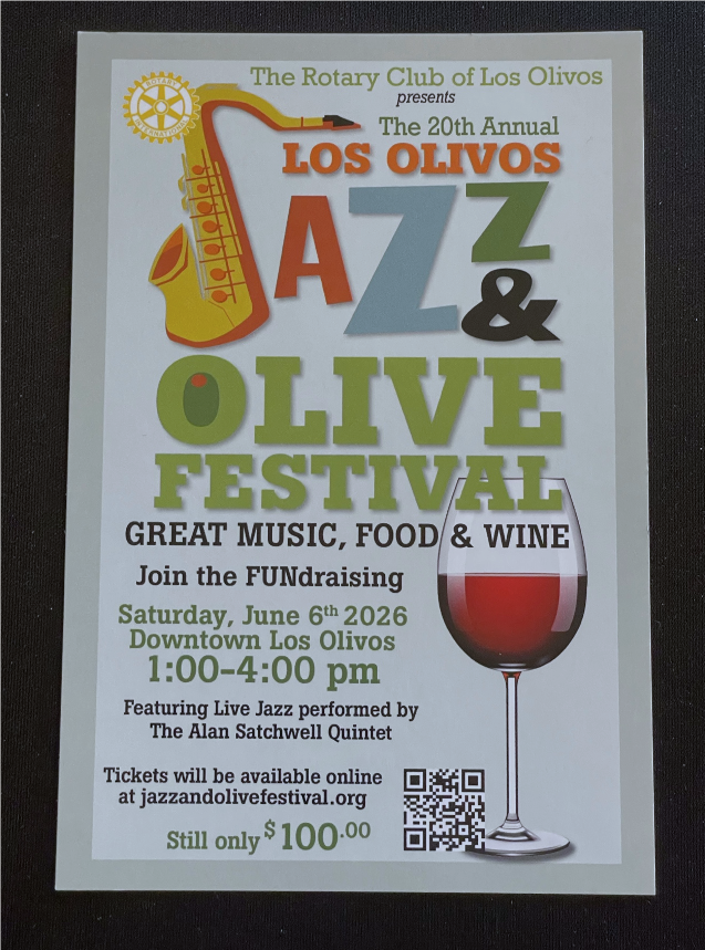 This year marks a milestone for the Rotary Club of Los Olivos as we celebrate the 20th year of Jazz & Olive. The Rotary Club of Los Olivos contributes all festival proceeds directly to local scholarships and to local and international community service projects.