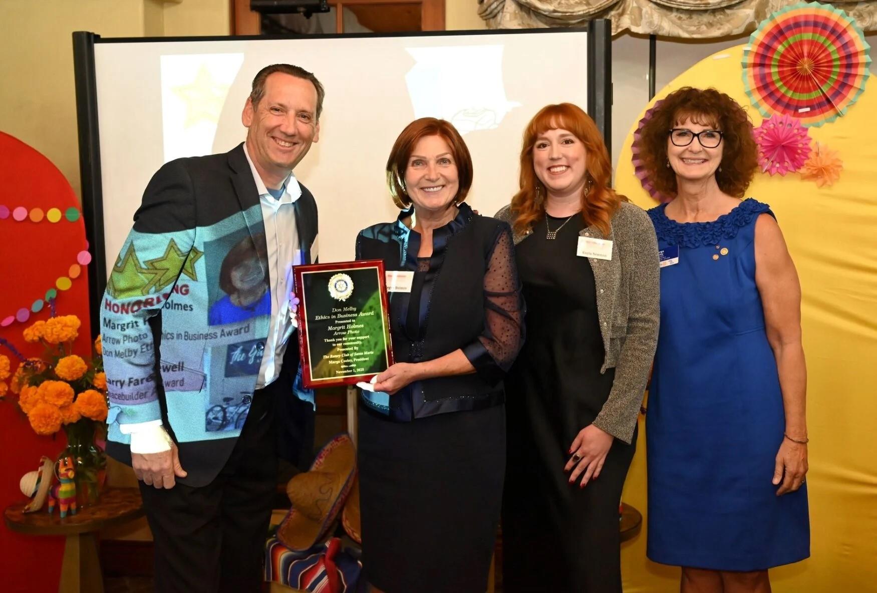 Margrit Holmes, owner of Arrow Photo, was honored Saturday with the Don Melby Ethics in Business Award by The Rotary Club of Santa Maria Noon, and longtime business owner, missionary and mentor Larry Farewell was recognized with the Peacebuilder Award.